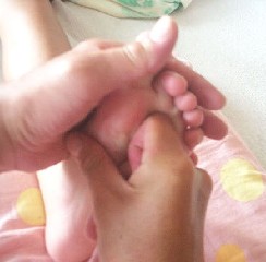 なれると、一番、力が入ります。親指の関節を立てて、あとの指は足を包むようにします。